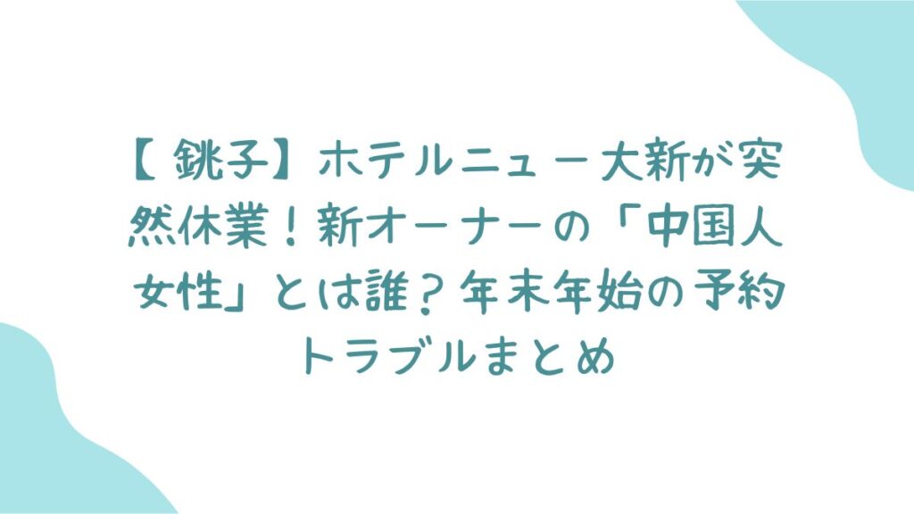 千葉県銚子市の老舗宿泊施設「ホテルニュー大新」が、書き入れ時である年末年始を目前に突然連絡が取れなくなり、事実上の休業状態に陥っていることが判明しました。