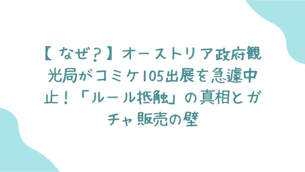 - オーストリア政府観光局のC105出展中止は、「頒布方法(ガチャ等)がルールに抵触する恐れ」があったため。
