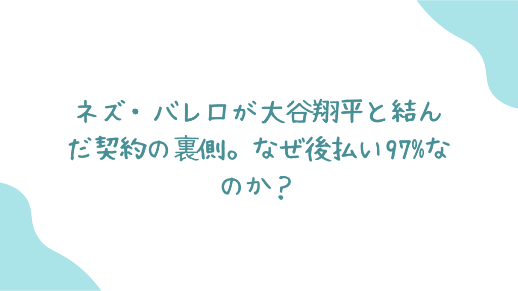 (出典)PRESIDENT Online:「年俸の97%が後払い」だけでも異例なのに…大谷翔平が「10年7億ドル」契約に踏み切った理由 (出典) Mainichi Shimbun:大谷翔平の巨額契約を実現 代理人ネズ・バレロ氏とは何者なのか (出典) Number Web:大谷翔平が自宅で告げた「ドジャース入り」の決断…エンゼルスと大谷はなぜ別れることになったのか? (出典) Yahoo!ニュース:大谷翔平はエンジェルスとの契約を後悔しているのか?バレロ代理人の回答 (出典) Full-Count:大谷代理人、10年1014億円契約に大興奮「唯一無二で歴史的」 (出典) The Digest:「純粋に他人を思いやる心遣い」バレロ代理人が大谷翔平の契約舞台裏を語る (出典) Moneyizm:大谷選手はなぜ契約金を後払いにしたの?その仕組みについて解説 (出典) スポンサーリンク