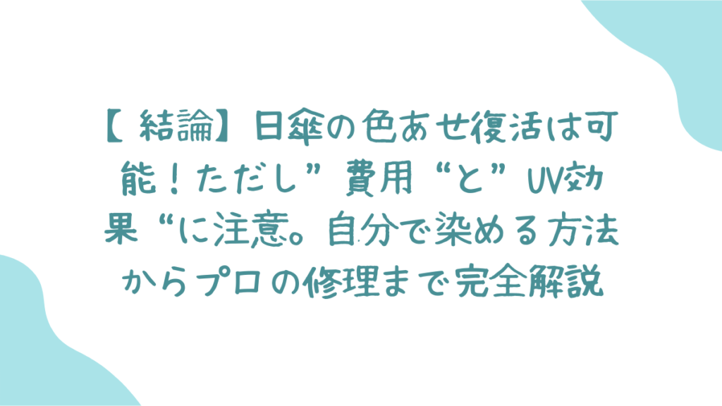 A3. いいえ、UVカット効果は回復しません。これは最も重要な注意点です。日傘のUVカット性能の寿命は、一般的に2〜3年と言われています。染め直しで見た目が綺麗になっても、紫外線から肌を守る機能は別。効果が落ちている場合は、市販のUVカットスプレーを併用するか、買い替えを検討してください。