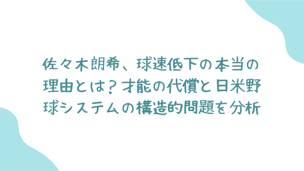 165キロの豪速球で日本中を沸かせた「令和の怪物」、佐々木朗希投手。しかし、鳴り物入りでMLBドジャースに移籍後、彼の代名詞であったはずのスピードは影を潜め、多くのファンが「一体なぜ?」と首を傾げています。しかし、一度立ち止まって考えてみましょう。これは単なる個人の不調なのでしょうか?