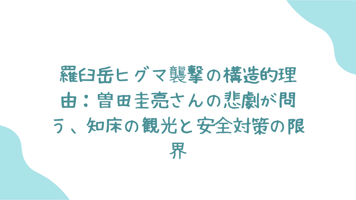 2025年8月14日、東京都の会社員・曽田圭亮さん(26歳)が羅臼岳下山中にヒグマに襲われ、死亡が確認されました。世界自然遺産登録後、初の登山者死亡事故という事実は、多くの人々に衝撃を与えました。友人を助けようと素手でヒグマに立ち向かった同行者の勇敢な行動も報じられましたが、私たちは感情的な側面だけでなく、なぜこの悲劇が起きたのかという本質的な問いに向き合う必要があります。