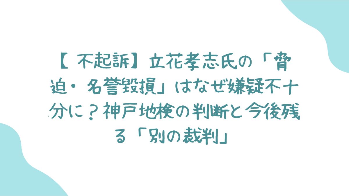 - 神戸地検は、奥谷県議への名誉毀損・脅迫容疑について立花孝志氏を不起訴(嫌疑不十分)とした。